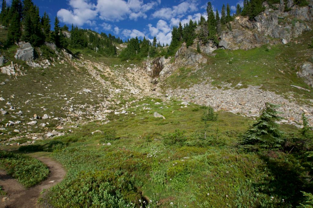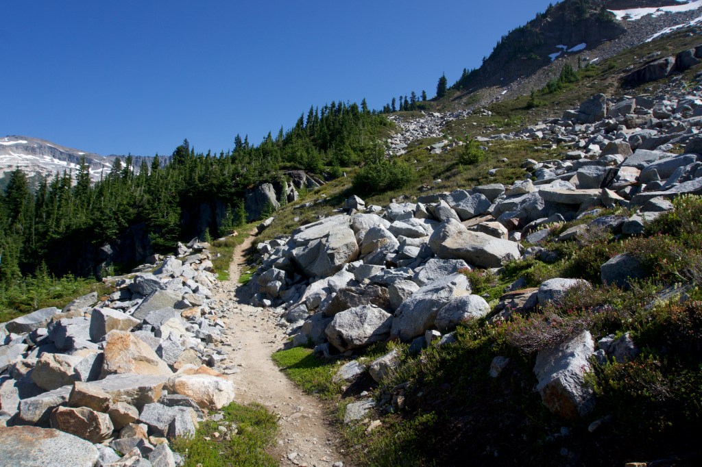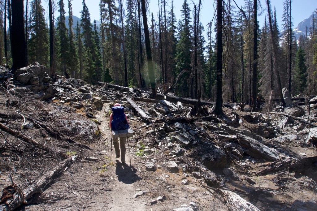 We finally rallied and started the upward climb. Blessedly, the bushwhacking only lasted for a mile or so (we were mentally prepared for three). The trail was in shade so it was cooler, it was decently graded, and I didn’t feel like I had to stare at the ground the entire time looking for hazards. We had been thinking about camping at Mica Lake, but ended up camping at the site 0.5 mile N since it was the only one with a toilet.
