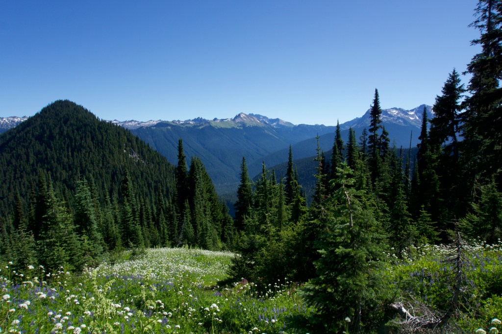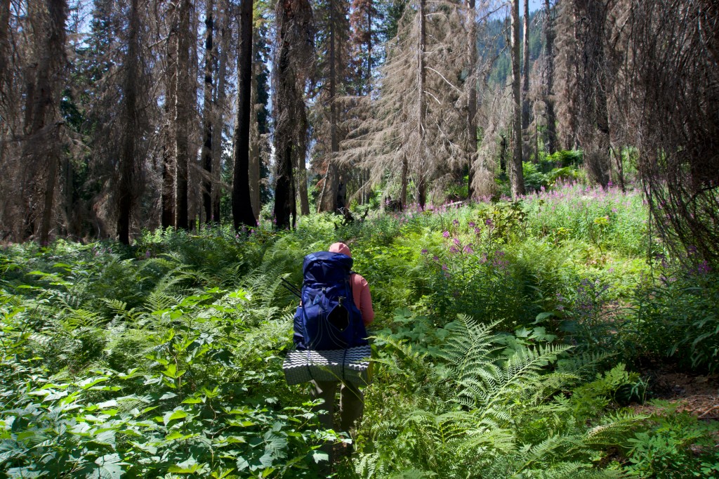 Today we were feeling slow and exhausted and didn’t get started until 10am, which is appallingly late by hiker standards. We pretty much spent the whole day climbing. At first it was somewhat boring and in the forest. There were so many huckleberries though! I dubbed this section of the trail “Huckleberry Heaven.” We gorged ourselves on the best, juiciest berries we had seen on the PCT. Finally, the climb moved out of the forest and into annoying, thick, brushy plants that covered the trail. I didn’t particularly enjoy it since it constantly seemed like we were almost about to see a view, but there were no views, and we just kept climbing up. (I’m a little spoiled from hiking in the Pacific Northwest, can you tell?) Finally, we came to a nice meadow with some views. Soon after we were back in the forest and continuing our climb. When we finally reached the top of the climb, the views were spectacular.