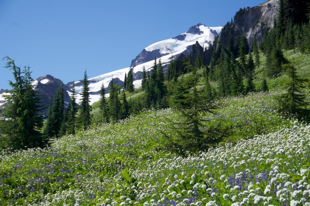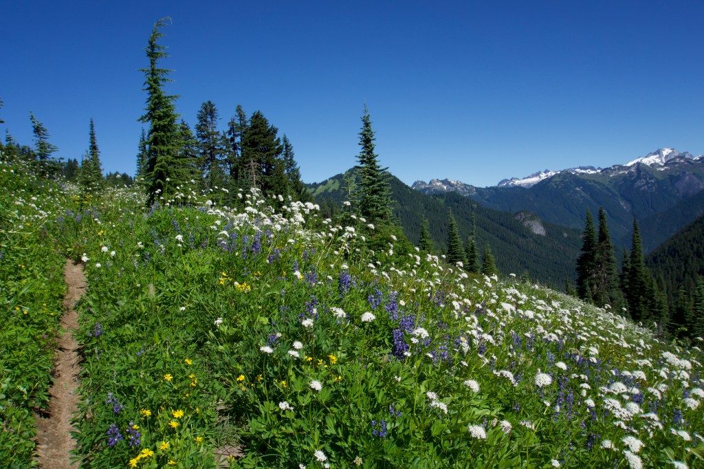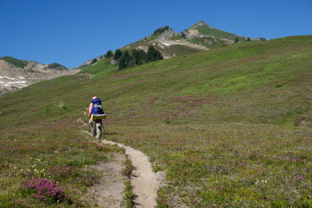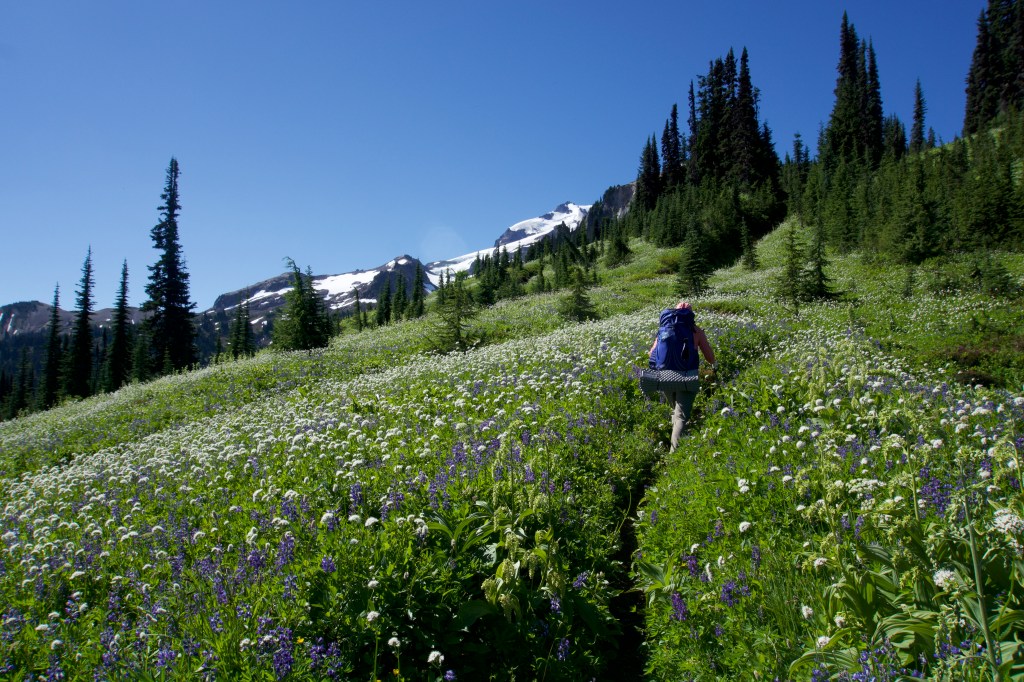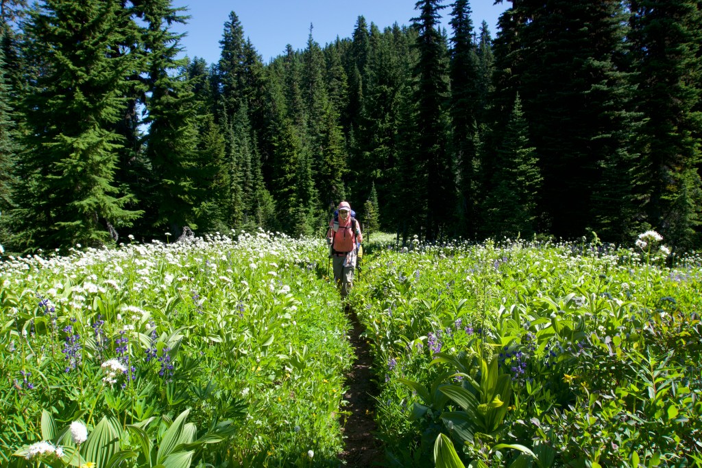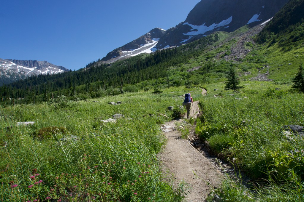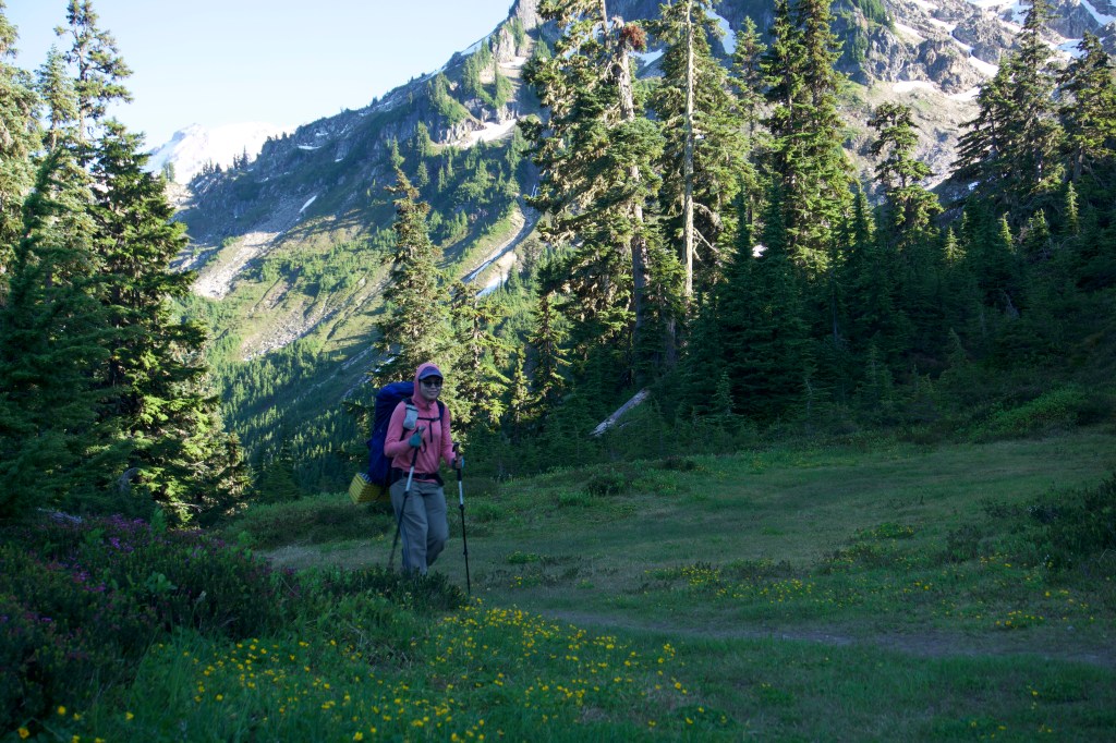 Well, the day was off to an auspicious start of 3.7 miles of never-ending switchbacks and surprise bushwhacking while desperately needing to use the toilet. Also, it was quite hot despite it being early in the day. I felt like I was going at a snail’s pace. At one point, I thought we had reached the top, but I was wrong. There was a still another top! (There’s always another top.) When we reached the actual top it was so incredibly beautiful that I thought it was almost worth it to get there. (But maybe not. If there was no way out except that horrible bushwhacking, I would be fine never seeing Section K again.) I almost cried at how beautiful it was. It was an idyllic green meadow filled with wildflowers and the most beautiful mountain views. Words and even pictures don’t do it justice. We should have taken more photos, but we were both super cranky and just wanted to get to the toilet. We finally made it, and the toilet views were indeed as incredible as advertised.