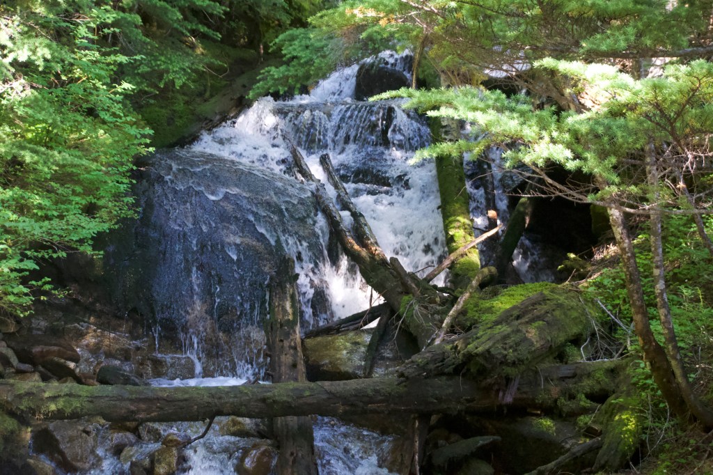 With our business done, we were feeling better and ready to continue. We went through a couple miles of idyllic alpine respite, which included horribly huge black flies the size of bumblebees, one of which bit me (of course). I pray that they are a species native to that tiny area and that they never leave to come find me again. We started on the downhill. We knew that a 7 mile section of “significant enough to complain loudly about it on Guthooks” bushwhacking was about to occur. We were lulled into a false sense of security for a mile or so. There was some brush but it wasn’t that bad. Then, the true bushwhacking started.