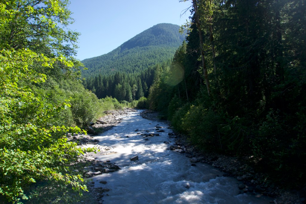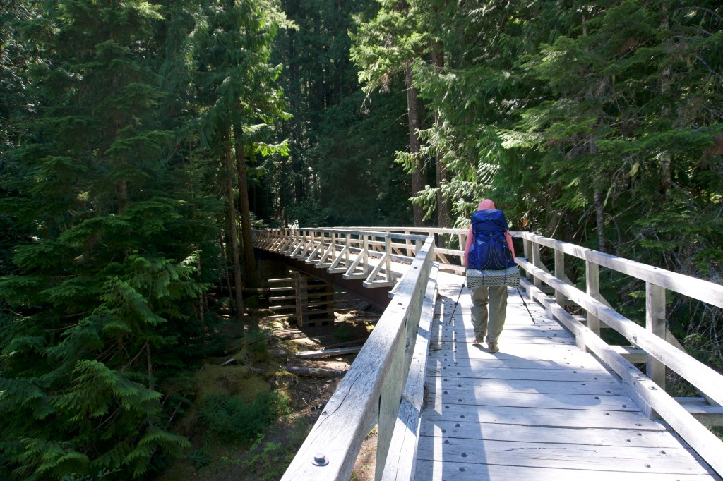 We did 15.9 miles today, but it was pretty easy. We had the most amazing 9 mile stretch of downhill. There was no brush and the elevation profile was low grade and easy on the knees. We flew through at 3 miles an hour, which was quite fast for us! We had lunch at the Suiattle River. The trail takes a several mile detour in order to use an established bridge across the river. Supposedly there’s a ford that can be used as an unofficial shortcut, but it looked impossible. I was glad we used the bridge.