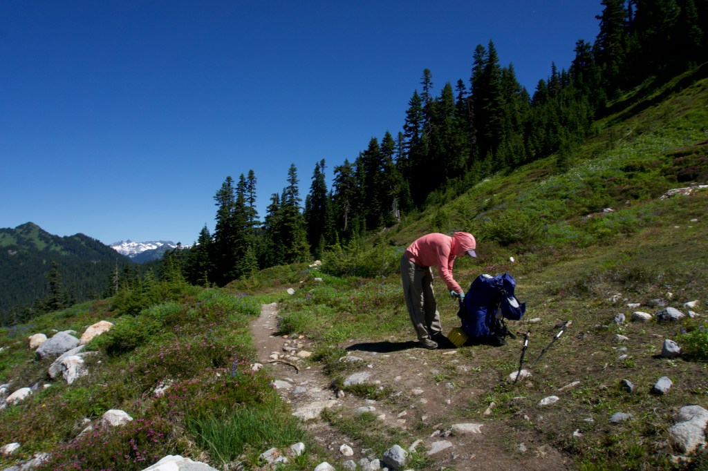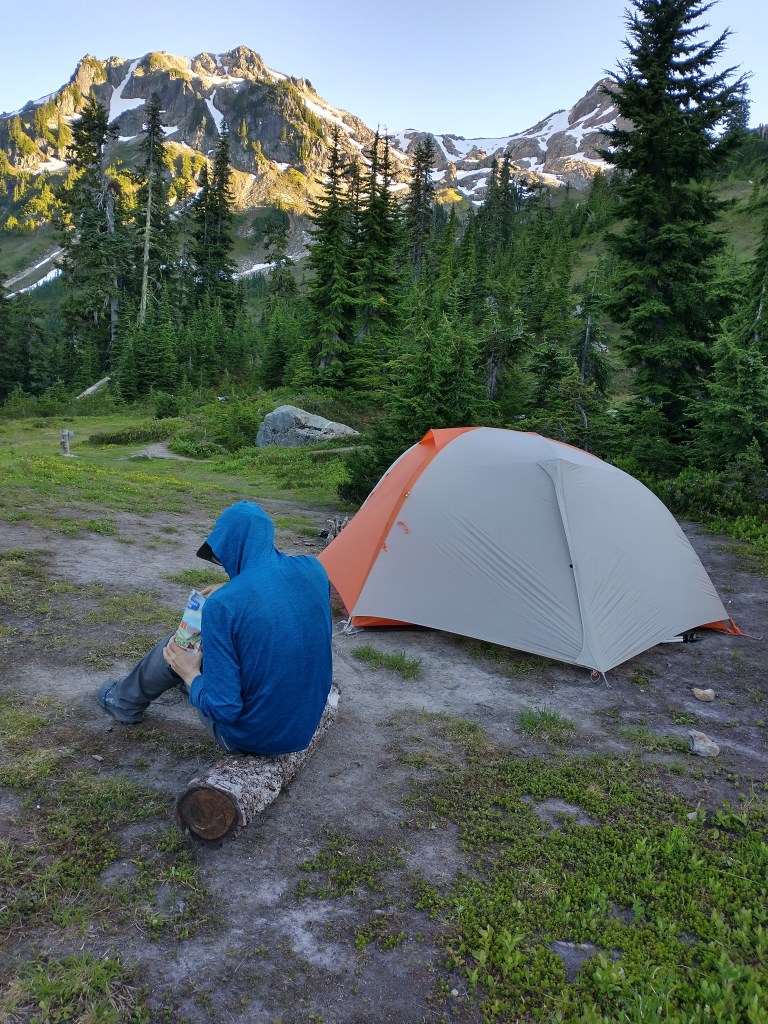 We finally started lugging ourselves and our extremely heavy packs uphill. The climb out of Stehekin is 16 miles long. Yes, you read that correctly – 16 miles of continuous uphill. Our goal for the afternoon was to hike 8 miles. It felt like the longest 8 miles ever. It was entirely uphill, our packs were enormous, and we were stuffed with food from the bakery. We finally waddled into camp at 8:40pm. We had to get our headlamps out while setting up camp, which we did efficiently and without words (I guess we’re getting better at backpacking). We ate our dinner in the tent. It was so, so worth the weight to pack out a sandwich and an oat bar from the bakery. The camp had no bugs, which was amazing. We wondered how long the lack of bugs would last.