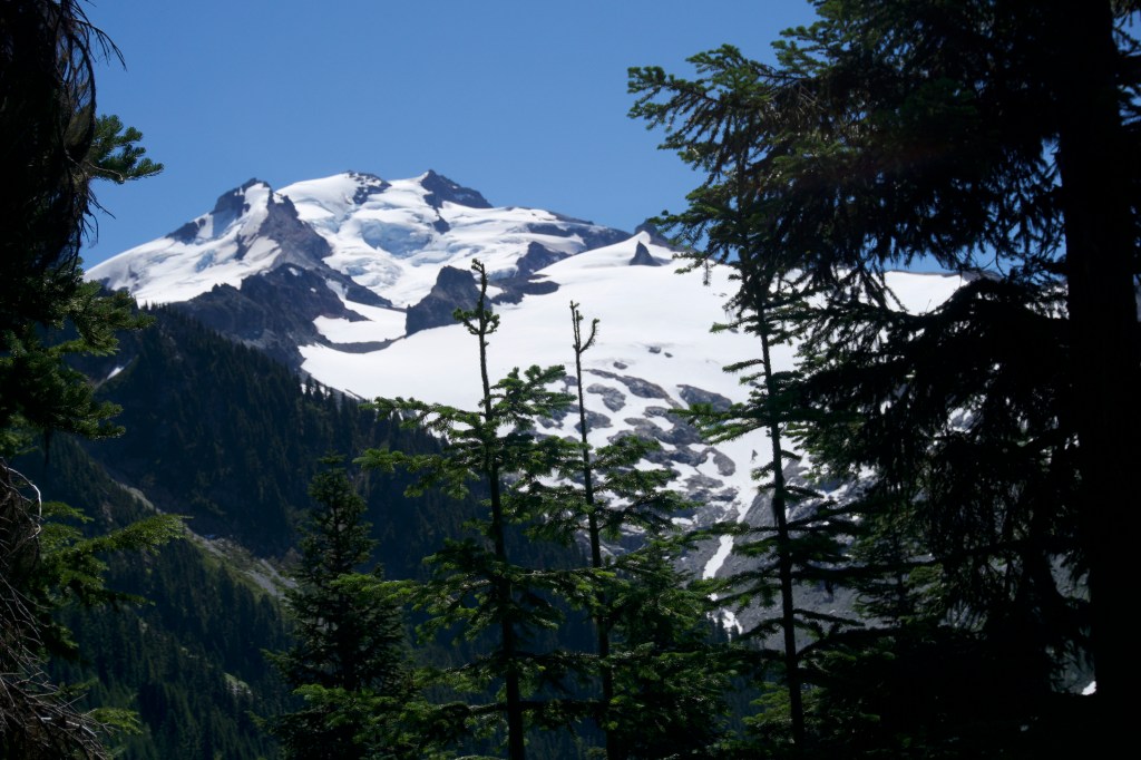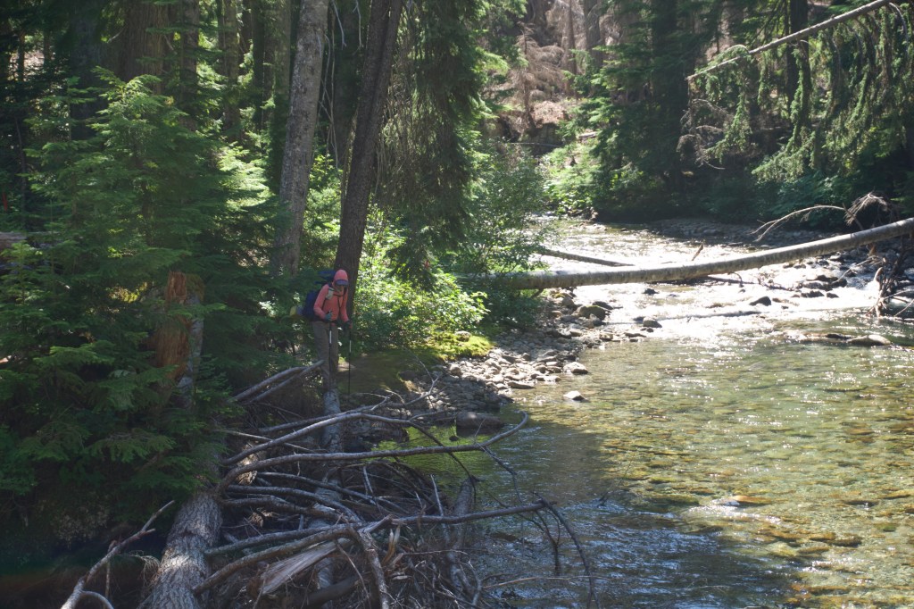 As we were walking, I came to the conclusion that the people who designed Section K hated hikers. There was nowhere to stop and enjoy the view of Glacier Peak. The trail also went just below a ridge which would have given us perfect views. Instead we were in the forest. We encountered some mild prickly bushwhacking on the way down (before I would have complained, but nothing can compare to the bushwhacking of the day before). There were so many creek crossings.