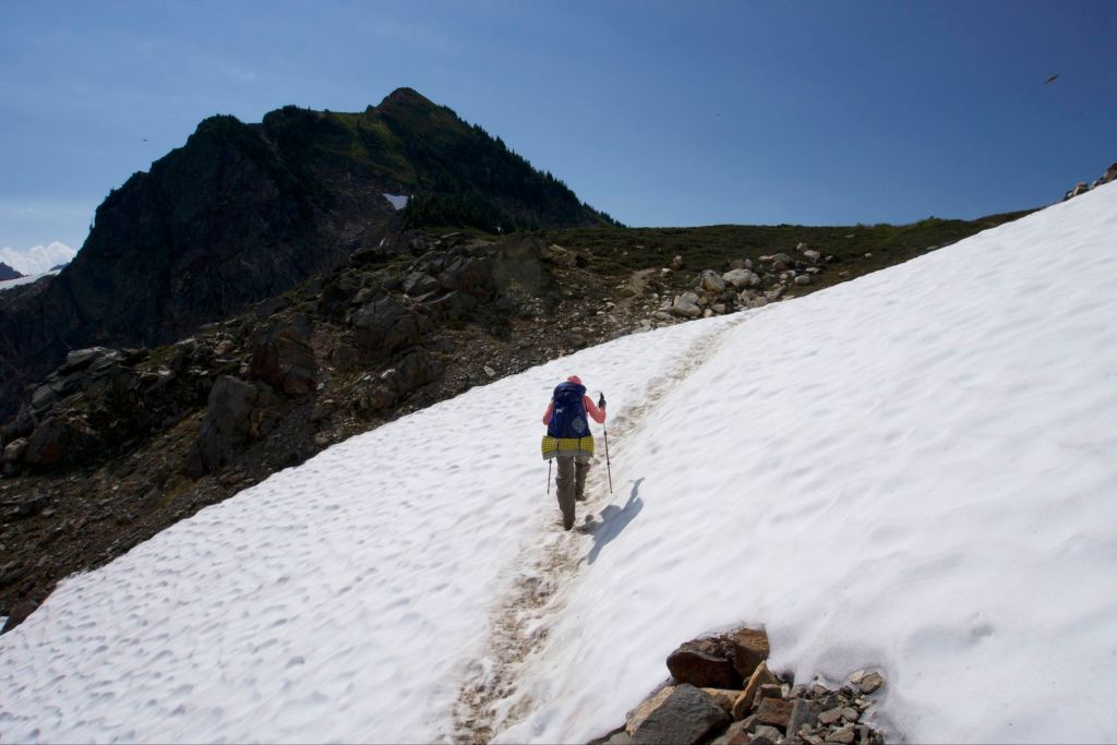 After Mica Lake we had a tiring, exposed climb to Fire Creek Pass. There was a small patch of snow near the top of the pass, but the snow was not difficult or scary at all. That’s the only snow we’ve seen so far in this section. The downhill was amazing – we saw the most amazing view of Glacier Peak. I can’t describe exactly how I felt upon finally seeing Glacier Peak, but I felt that it was all worth it. (Now would I do Section K again? I don’t know. But it was definitely was worth seeing Glacier Peak like that.) We literally sat down in the middle of the tiny trail and ate a snack to admire the view.