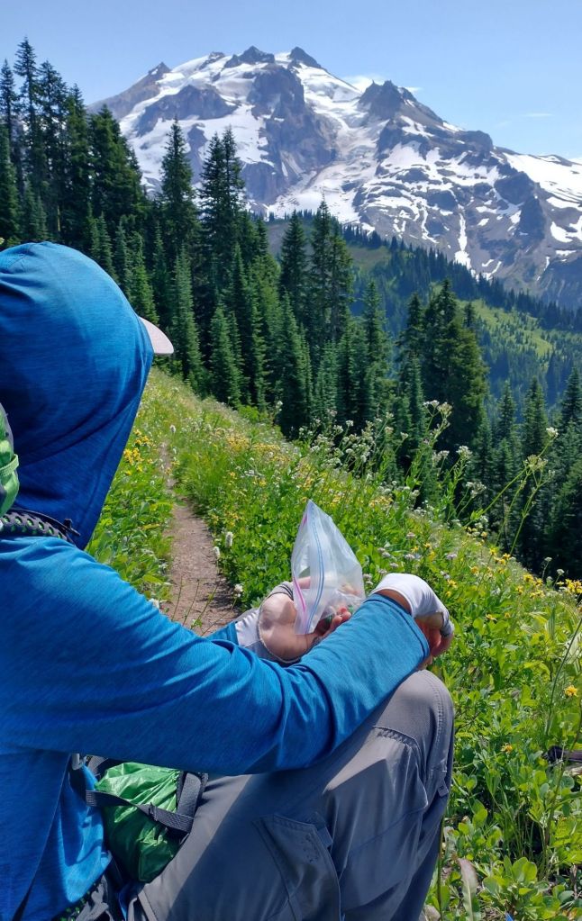 Today was the day! We were finally returning to civilization for a brief interlude in our wilderness journey. We were so stinky, so hungry, and actually ran out of snacks for the first time. I had been hungry yesterday, but today I was so hungry that I was running out of steam. I told Tim that I had this fantasy that when we arrived at Stevens Pass, someone would be in the parking lot grilling burgers and offer me one. This was highly unlikely due to Stevens Pass being closed due to COVID, but hey, a girl can dream, right?